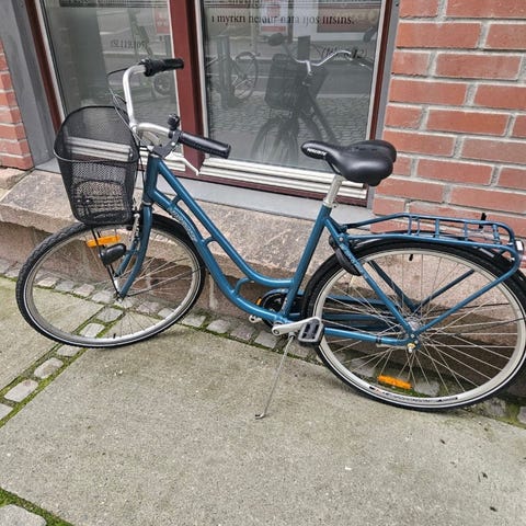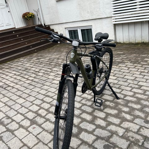 Sykkelen er godt brukt, har normale brukstegn som litt rust på enkelte skruer og små riper i lakken, men alt fungerer som det skal – girene går fint, bremsene biter godt, og dempinga virker.