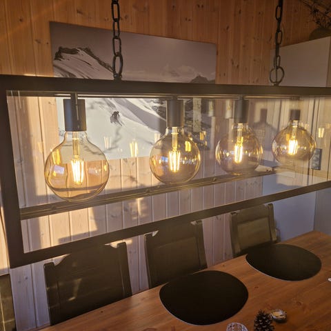 Flott taklampe til salgs. 4 pærer som gir godt lys over for eksempel ett spisebord. Passer fint til hytte etc. Hentes på hytte i Hemsedal frem til 3. Januar.