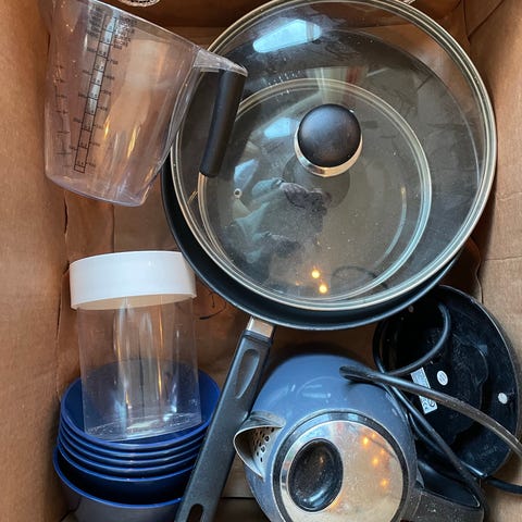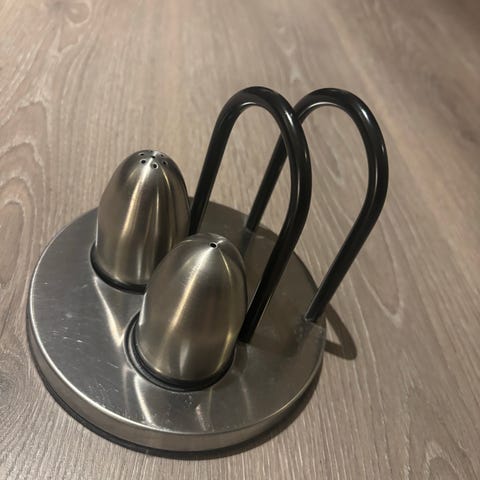 IKEA servise sett bestående av grå tallerkener og kopper.