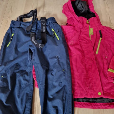 Jotunheimen Røver’n jakke i strl 104 (4 år). Blå med rosa detaljer. Utsiden er 96% polyester og 4% elsatan og innsiden er 100% polyester. Nypris: 799 kr.