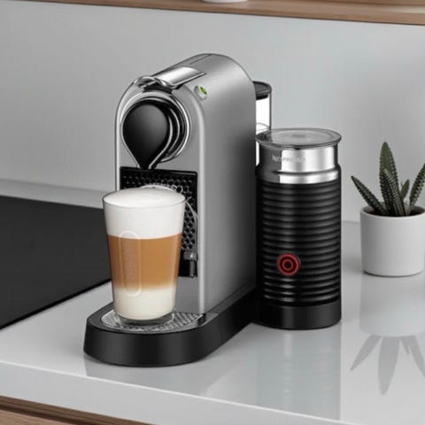 Nespresso Citiz kaffemaskin med melkeskummer. Kompakt design med metallfinish og integrert melkeskummer for tilberedning av kaffe og melkebaserte drikker.