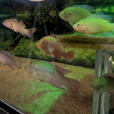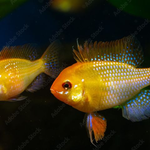 Har et nydelige blå acara par som blir litt for aggressive når de yngler. For å bevare freden i selskapskaret ønsker jeg derfor å selge disse. Hunnen er størst og er ca 8-9 cm, mens hannen er et par cm mindre enn det.