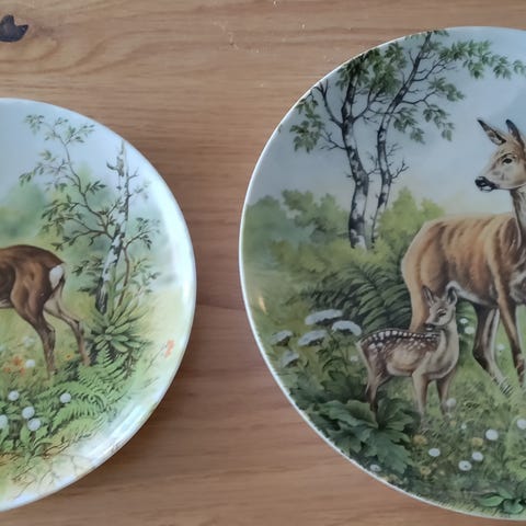 Tallerken med motiv av hjort i naturmiljø. Tallerkenene har dekorative detaljer og er laget av porselen. Passer til dekorasjon eller samling.