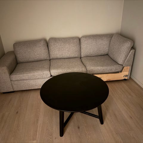 Er i utgangspunktet en sovesofa, men platen i uttrekksdelen er knekt..så fungerer best som vanlig sofa. Mulig det kan fikses? Ellers uten hull og fin i trekket. Stått i loftstue og brukt av barn, både som sofa, seng og trampoline. Sjeselongen kan byttes side på. Gis bort, må hentes.