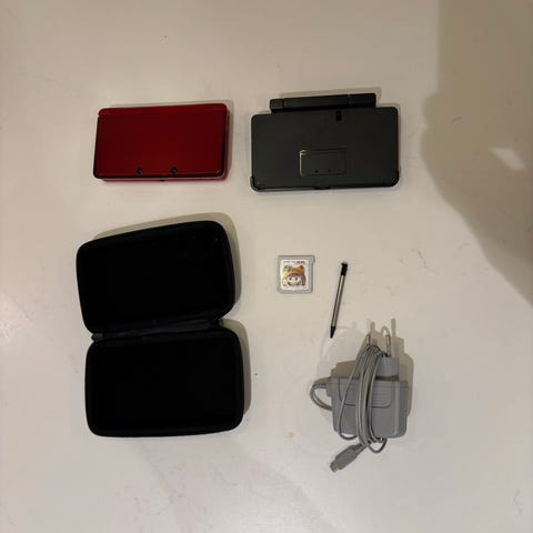 Nintendo 64 spillkonsoll med tilhørende kabler. Konsollen har standard design og farge, egnet for bruk med Nintendo 64 spill.