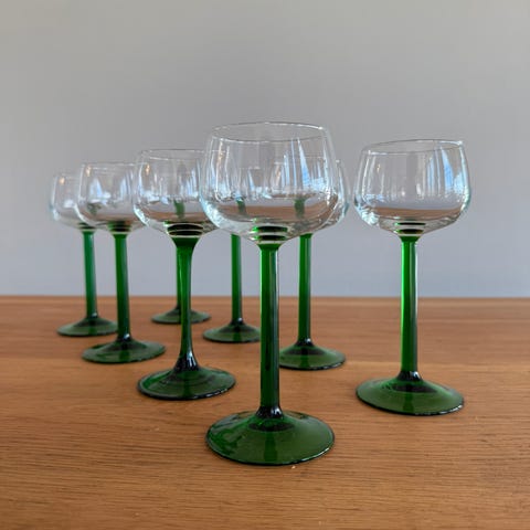 Pent sett med grønne vintage vinglass med dekor og gullkant. Klassisk og elegant uttrykk, trolig fra midten av 1900-tallet. Normale bruksspor, men i fin helhetsstand. Passer godt til både pynt og bruk.