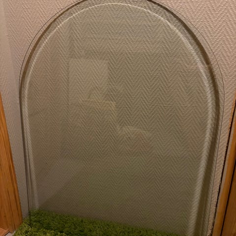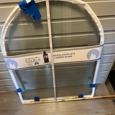 Selger denne klare glassplaten. Total lengde er 98 cm, og lengden på åpningen for peis er 42 cm. I god stand!