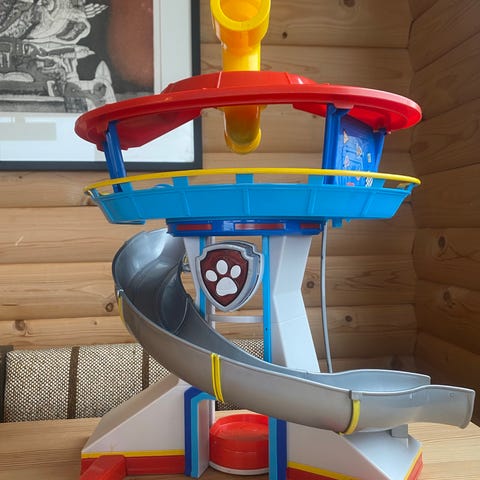 Paw Patrol leketårn med rampe og flere små figurer. Laget i plast med fargerike detaljer i rødt, blått og hvitt. Passer for barn som liker rollelek med Paw Patrol-tema.