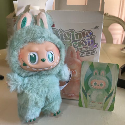 Ekte labubu kjøpt i Thailand for 800kr. Går an å sjekke at den er ekte ved å skanne Qr koden. Exciting Macaron Vinyl Face dukke i rosa farge .