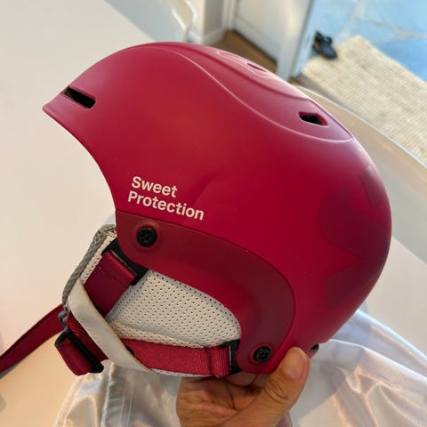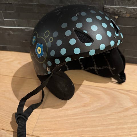 Bula Frost Ride skihjelm med hvit base og rosa blomster- og kaninmotiv. Hjelmen har justerbar hakestropp med rosa detaljer. Designet for å gi beskyttelse ved vintersportaktiviteter. Str 56 cm. Kan hentes på Nordstrand