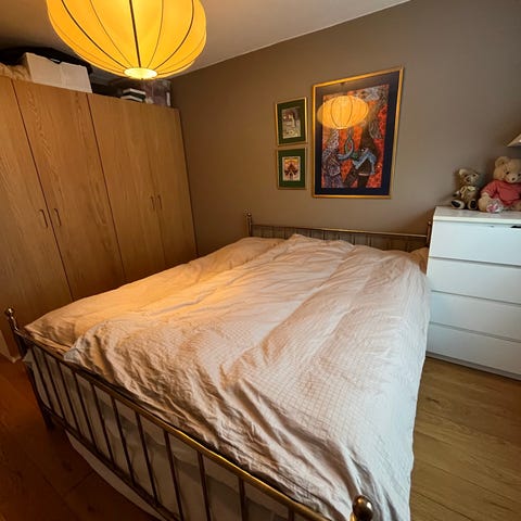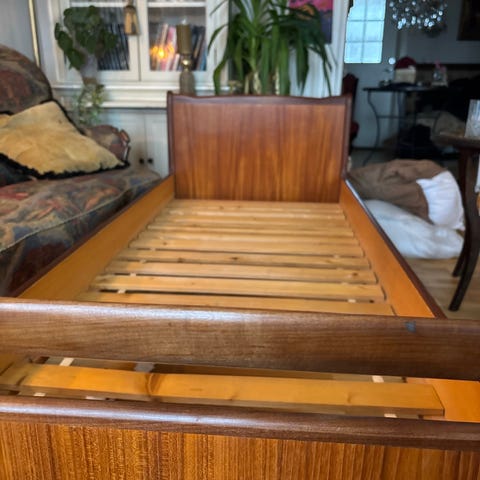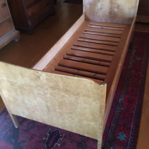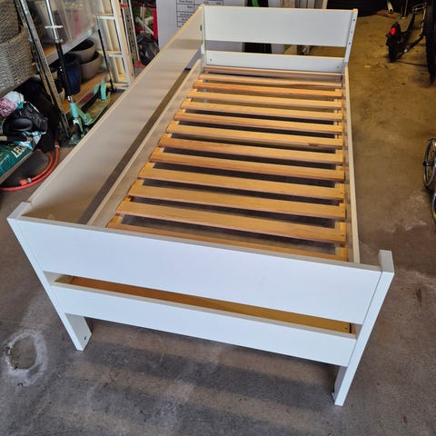 Liten “M” tegnet på sengehesten, ellers normal bruksslitasje.