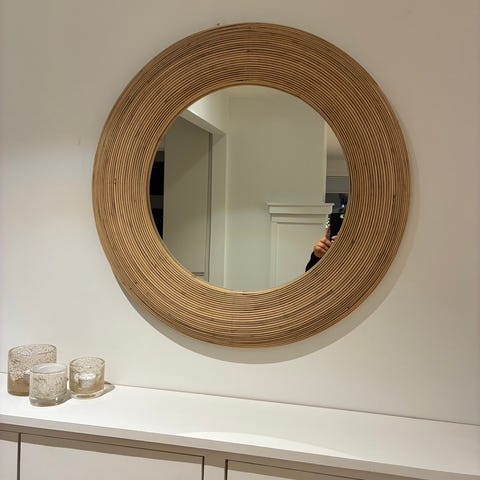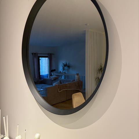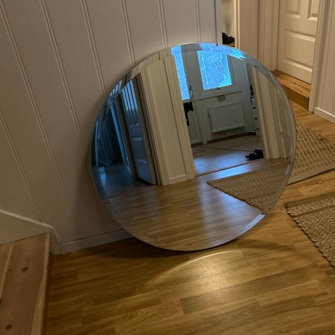 IKEA rundt speil med ramme i rotting. Speilet har en dekorativ og naturlig utforming, egnet for veggmontering i ulike rom. 55 cm. Selges da det ikke er i bruk. Hentes på Lund.