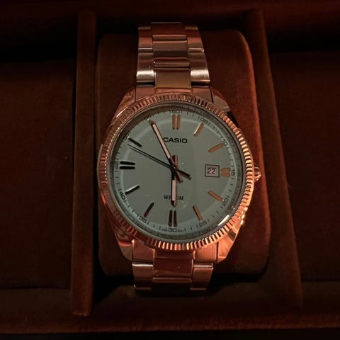 Casio unisex armbåndsur med turkis urskive, analog visning og datovisning. Klokken er vanntett opptil 5 ATM og har kvartsurverk. Armbåndet har en bredde på 1,5 cm og en omkrets på 20 cm (one size). Urskivens diameter er 3,2 cm.