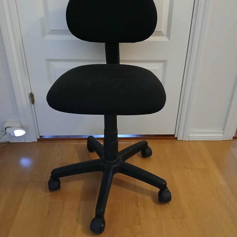 OK kontorstol. Venstre armlene er limt og forsterka etter skade, fungerer ok. Ei rift framme på sete. Elles funksjonell. Ikkje i bruk lenger her.