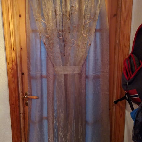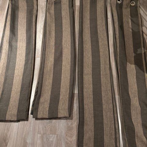 Lyse pene gardiner 220 H , 4 stk, selges kr 150, pr stk. Lameller 4 stk, H 205, kan tilpasses, kr 2750, eller bud. Lilla Velour gardiner, 2 stk med maljer, H 240, selges kr 150, pr stk.