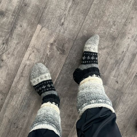 Håndstrikkede ullsokker i grått med rosa og grønne detaljer.