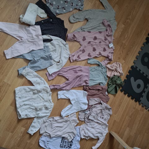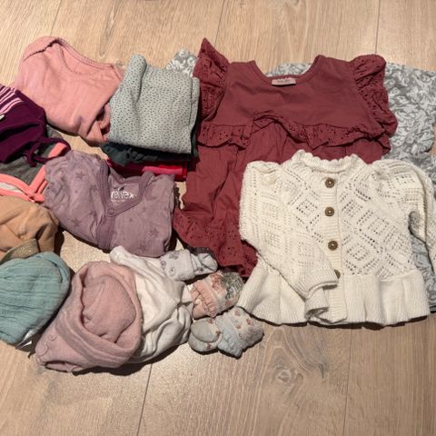 Klespakke til jente i størrelse 62. Klærne er brukt av 2 jenter så noen av plaggene er litt utvasket. Noen er mindre brukt.