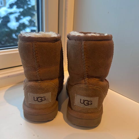 Helt nye Ugg Australia for barn i fargen chestnut. 100% saueskinn og ull. Litt usikker på størrelsen da det ikke er oppgitt, men vil tro det er ca Strl 26-27 (for store for min 3 åring). (NB: smal for å få foten oppi). Nypris: 1000 kr.