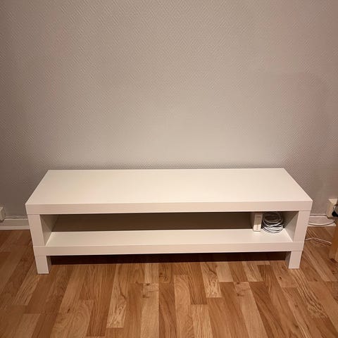 Pent brukt TV-benk fra IKEA i hvit. Liten skramme som vises på bilde. Praktisk med to skuffer.