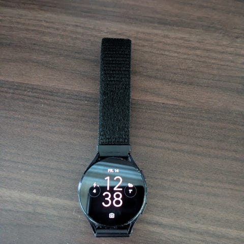 Samsung Galaxy Watch5 smartklokke med 40 mm urskive og lys rosa reim. Smartklokken har funksjoner for helseovervåkning og tilkobling til smarttelefon.