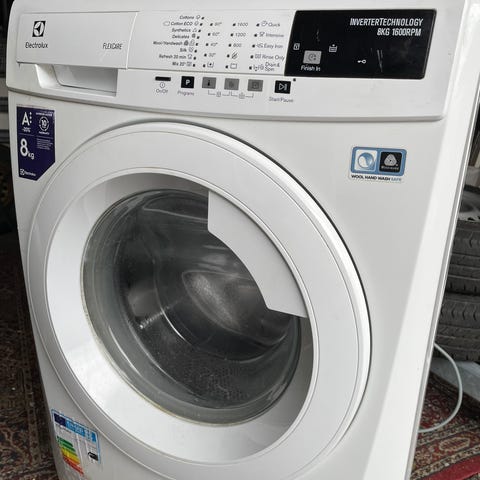 Matsui Frontmatet vaskemaskin med frontlading. Maskinen har flere vaskesykluser og kontrollpanel med knapper og dreiebryter for innstillinger. Energi-effektivitet og kapasitet er ikke spesifisert.
