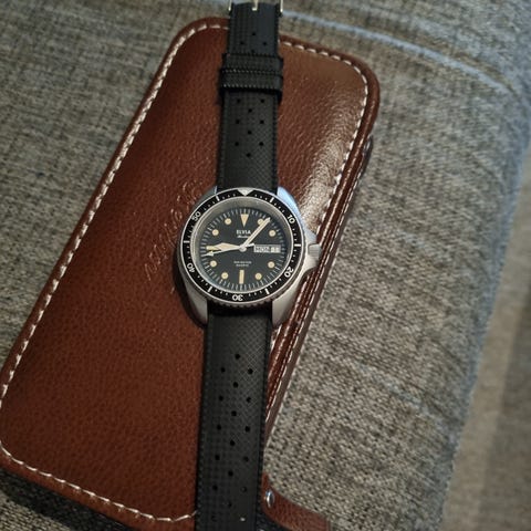 Kommer med en original og ubrukt gummirem, samt en brukt 20 mm NATO-rem. Eske medfølger, samt ekstra ledd og et sett med Scurfa sine spring bars. Disse er modellert etter barettene (norsk ord for spring bars) som ble brukt på to veldig kjente, sveitsiske urmerker jeg ikke kan nevne med korrekt navn i annonsen. Selve urkassen er også samme størrelse som en av utgavene av Ro Lex Sub-mariner.