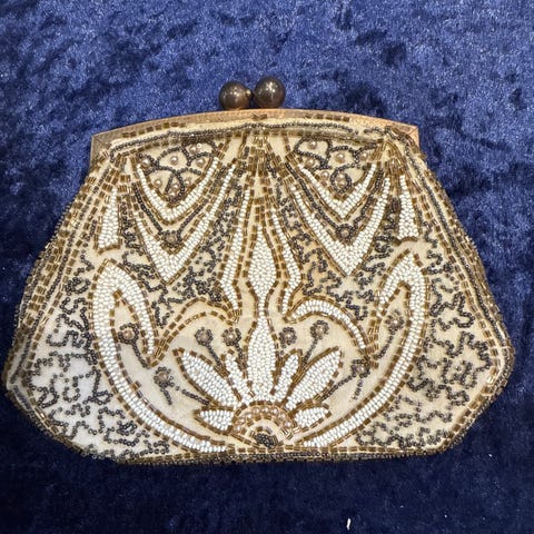 Feilfri ubrukt veske med perlebroderi på alle sider, selv i bunnen. Fra sent 60-tall -tidlig 70-tall.