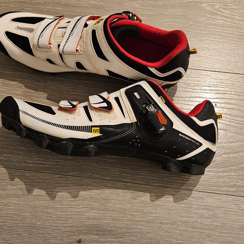 Mavic Crossmax sykkelsko i størrelse 48. Skoene har hvit og svart farge med rødt innerfôr.