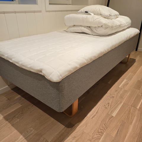 Pent brukt rammemadrass str 90x200. Følger med en tykk overmadrass.
