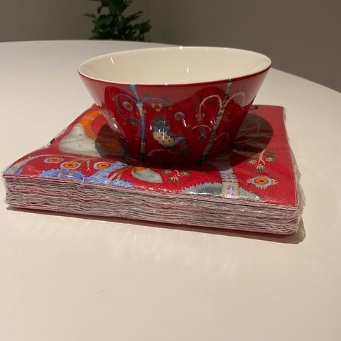 Iittala kopper 2 stk med dekorativt rødt og blått mønster. Laget i keramisk materiale, egnet for servering av varme drikker. Pris for begge til sammen kr 300,-.