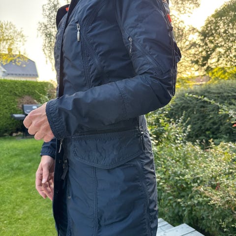 Jakken er mørk blå, med mange P.J.S detaljer. Innsvingen gir jakken et feminint preg. Jakken har en hette som kan tas av. Jakken har ingen skader eller merker.