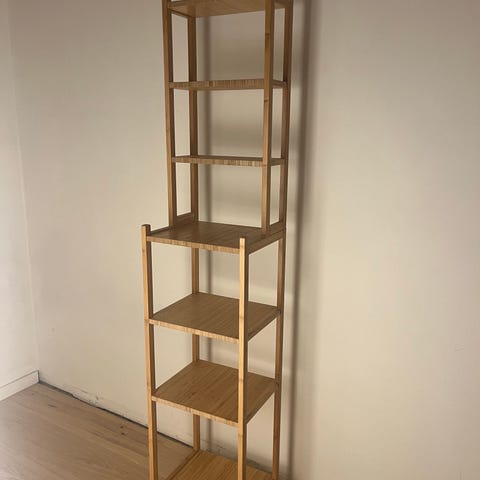 Rågrund baderomshylle i bambus fra IKEA med 7 hyller. Tåler vannsprut. Materialet gir et naturlig og lett utseende. Nypris IKEA 745,-