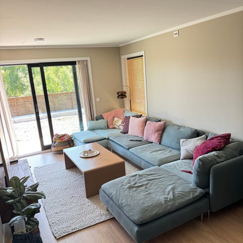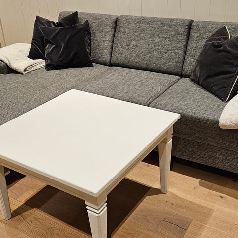 Sofaen ble kjøpt hos Skeidar for ca. 5 år siden og er pent brukt. Stoffet er helt og fint, med unntak av et lite svi merke (krølle-tang) på den lengste sjeselongen.