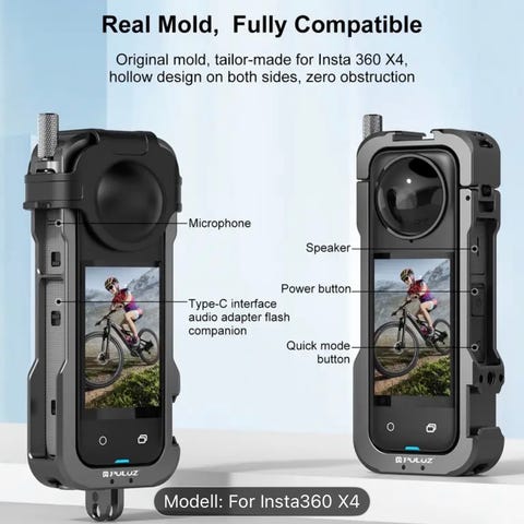 Tilbehør insta360 X4. Selger et Puluz Metal Protective Cage Rig Housing Frame med lens cover kompatibelt med Insta360 X4. Dette metallhuset gir god beskyttelse for kameraet uten å hindre bruk av knapper, batterirom eller mikrofoninnganger.