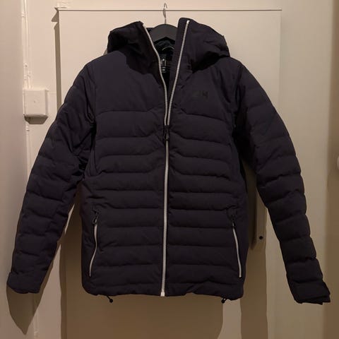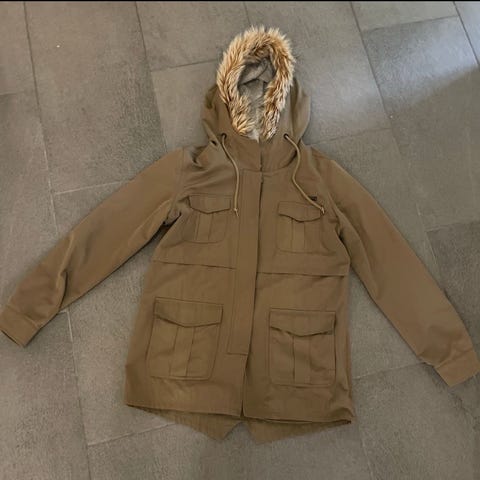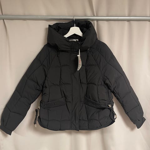 Jakken har quiltet mønster og hette, med glidelås og lommer.