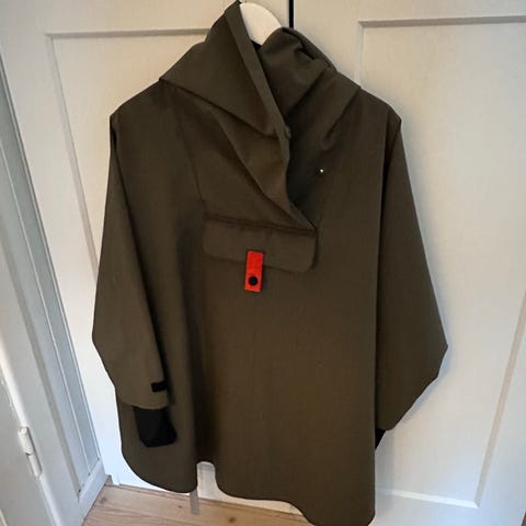 En lett og deilig regnponcho som er superpraktisk for norske forhold. Jakken er vindtett, har en vannsøyle på 20 000 og tåler kraftig regn, samtidig som den puster. Ponchoen har justerbar hette og ermer samt lomme med glidelås foran. Oversized passform med a-shape samt splitter på sidene. Jakken har teipete og forseglede sømmer som sørger for at vann ikke lekker gjennom. God jakkelengde til ca midt på låret.