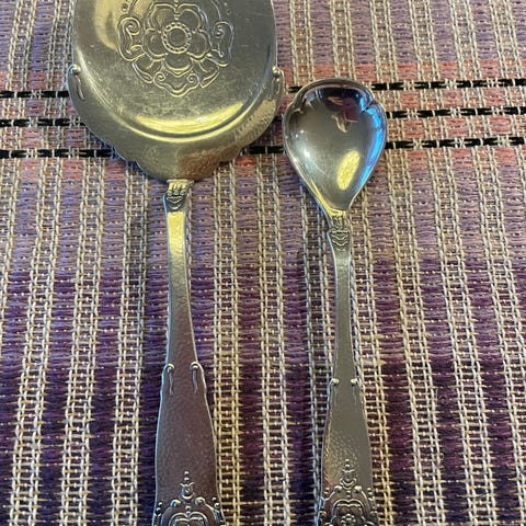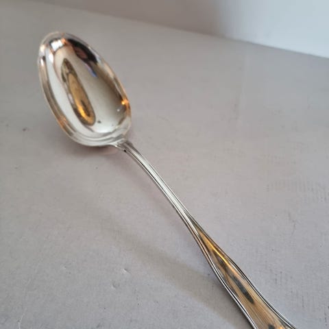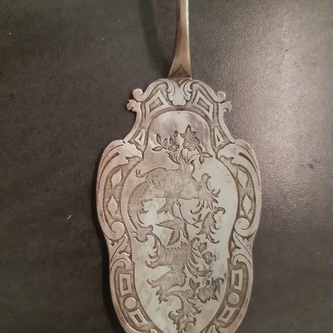 Sølv kakespade med dekorativt mønster. Laget i sølv, egnet til samling eller bruk som serveringsbestikk. Veier ca 43 g (veid på kjøkkenvekt) lengde ca 22 cm