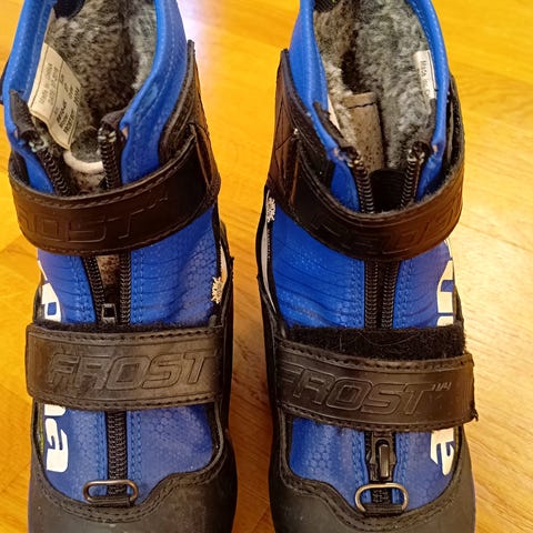 Alpina barneskisko i størrelse 27. Skoene er utstyrt med glidelås foran og snøring for justering.