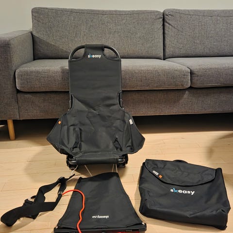 «Skeasy er en sammenleggbar slede, som får plass i en litt romslig dagstursekk. Stolen veier kun 1.9 kg og er rask og enkel å montere. Den passer alle vanlige skityper fra 90-140 cm med NNN-binding. Skeasy har høy rygg med håndtak for god kontroll i nedoverbakke.»