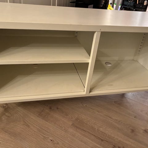 Kommoden er malt gul, og skulle nok gjerne hatt et nytt strøk. Skuffene er noe bøyde i bunn, og det er et lite mellomrom mellom to skuffer pga en manglede del. Likevel - tross støv - er den fullt brukbar.