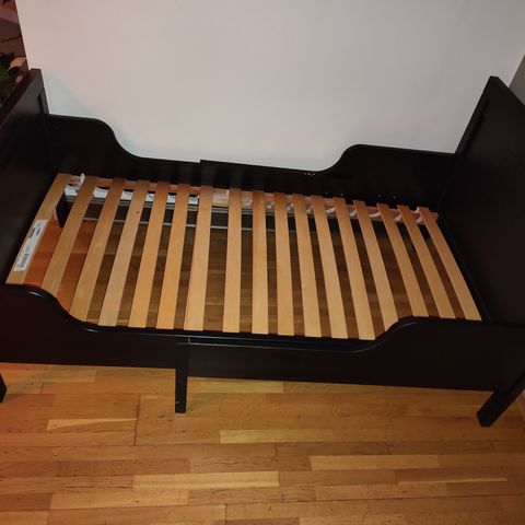 IKEA SUNDVIK uttrekkbar barneseng i hvit. Pent brukt, noen små klistremerker på siden. Madrass medfølger, to deler. Veldig pent brukt ingen merker på disse. Hentes.