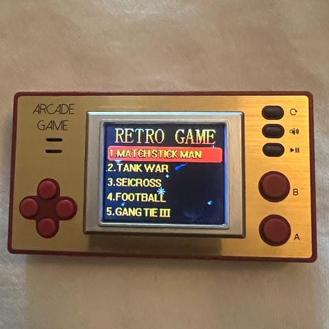 Retro Pocket Games bærbar spillkonsoll med over 150 innebygde spill. Konsollen har en skjerm, retningsknapp, og flere funksjonsknapper. Designet for bærbar bruk og enkel spilling på farten.
