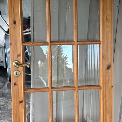 Innerdør i tre med glassfelt og karm. Døren har håndtak og lås, og er i naturlig trefarge. Passer til bruk som romdør innendørs.