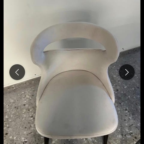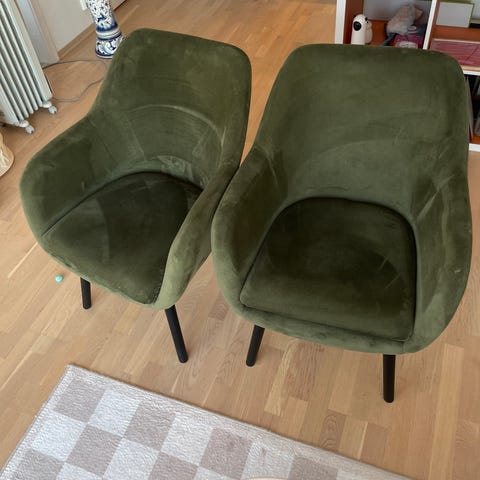 9 stk brukte stoler i velurstoff. Sittehøyde ca 44cm. Stolene er opprinnelig kjøpt hos Zederkof.no.