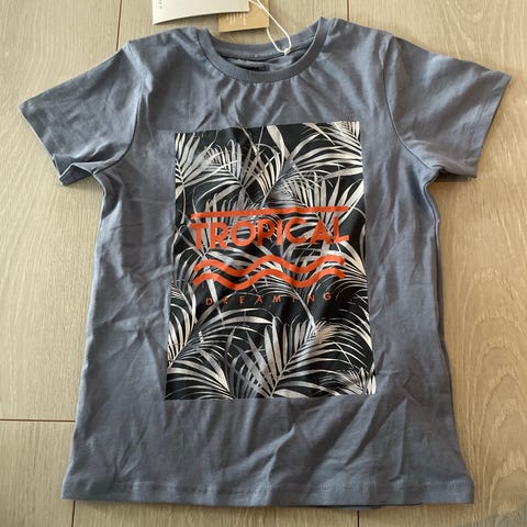 Gul Name it T-skjorte for barn i størrelse 116 (6 år). Materiale bomull. Med motiv av hund / mops / pug som har på caps og hodetelefoner.