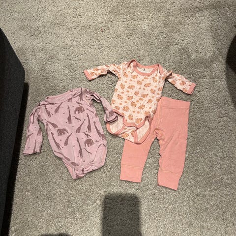 Stor pakke med 32 pent brukte babyklær for jente, størrelse 50–56. Inkluderer klær fra merker som Reflex, Name It, H&M, KappAhl og flere. Mange ulike plagg og farger, perfekt for små barn.