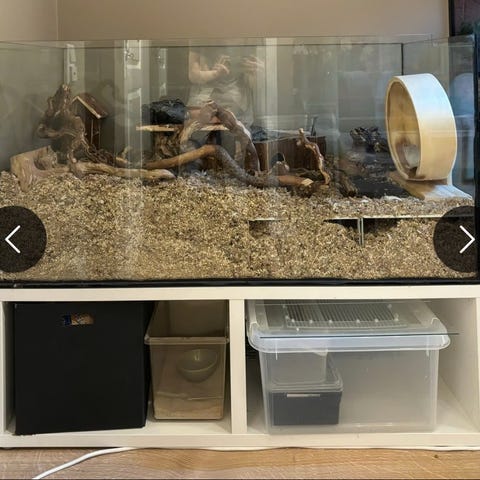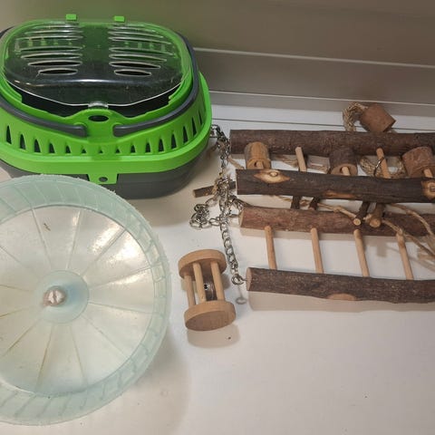 Hamster /mus bus fra Trixie. Brukt ca 6 mnd. Jeg har limt på en treplate i bunnen, da treverket var litt bøyd etter transport, og hamsteren gnaget der. Baksiden har en sprekke etter transporten, men hun har aldri gnagd der, og jeg har tettet sprekken. Ta kontakt om du har spørsmål.