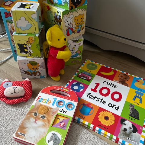 En myk bok med sterke farger, klaffer, ting som knitrer, speil, ting man kan bevege på.