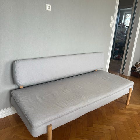 Fin lysegrå daybed som fungerer som sovesofa. Enkel å slå ut som dobbeltseng