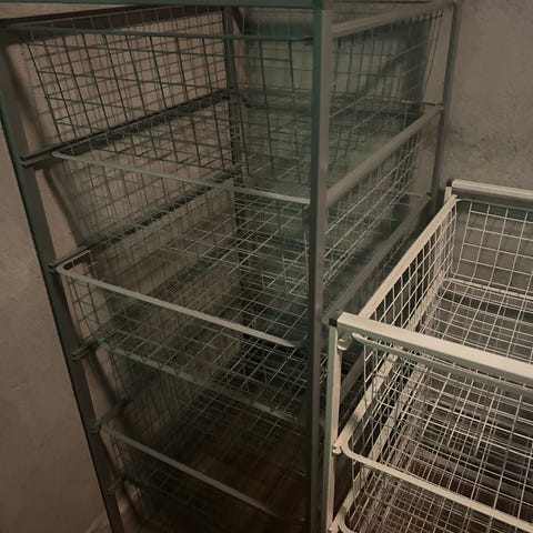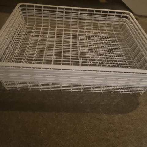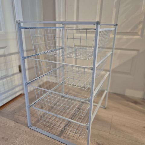 To pent brukte kurvstativ med kurver selges samlet til kr 200. de er ca 44 cm brede og 54 cm dype. Den høyeste ca cm 103 høy og den laveste ca 70 cm høy. De kan settes oppå hverandre.